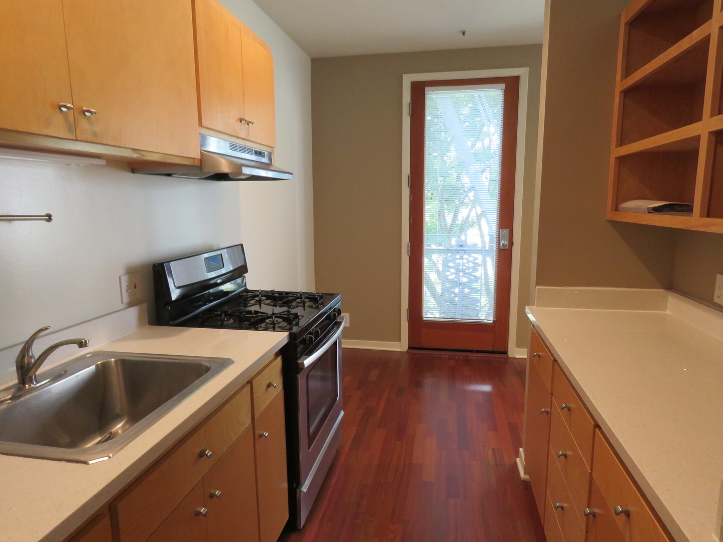 The condo consists of a living room overlooking the garden, a small dining area, a freshly updated galley kitchen with stainless appliances and quartz countertops, one bedroom with an attached modern bathroom and good closet space, and a small private balcony. One parking space is included and there is a private washer and dryer in the unit. Tenant pays PG&E and Water. Sorry, no pets.