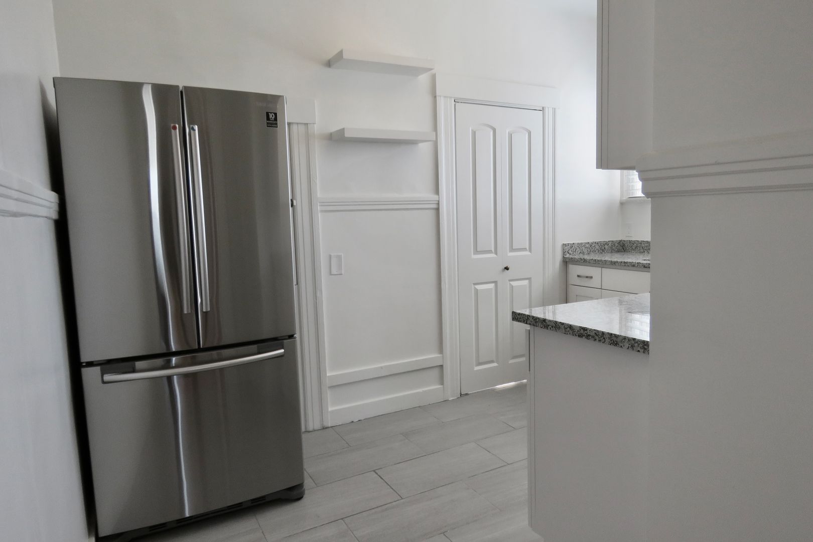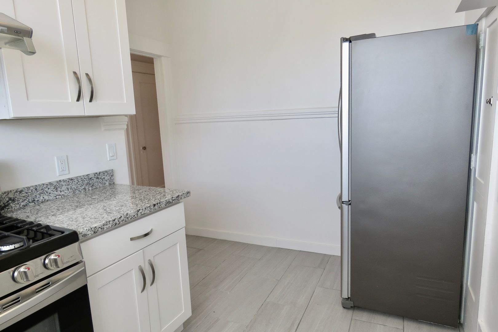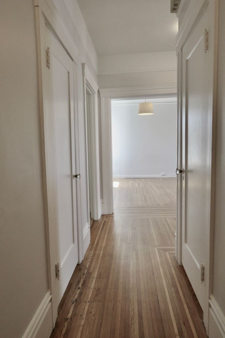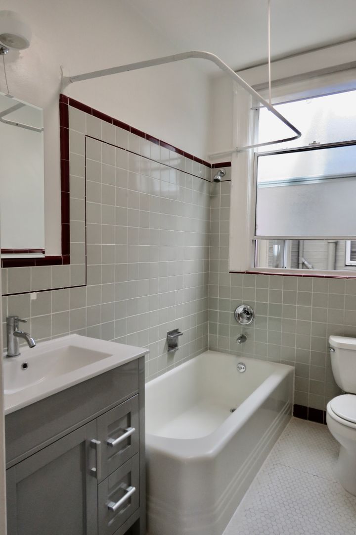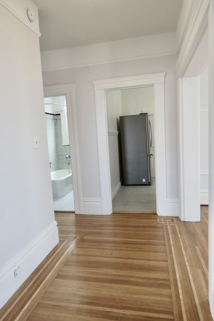 Located on the top floor in the back of a 10 unit building, this bright two bedroom unit features a newly remodeled kitchen with white shaker cabinets, granite countertops, and new stainless appliances (gas stove and refrigerator - no dishwasher) . There is 2- large north-facing bedroom with sunny bay windows, large closet and views of the golden gate bridge and Russian Hill. The updated bathroom still retains the older San Francisco charm with hex floor tile and a 1950s grey tile surround, but features a modern lacquer vanity. There are refinished original hardwood floors throughout and loads of period detail including a built-in, picture rail, high ceilings and pocket doors.